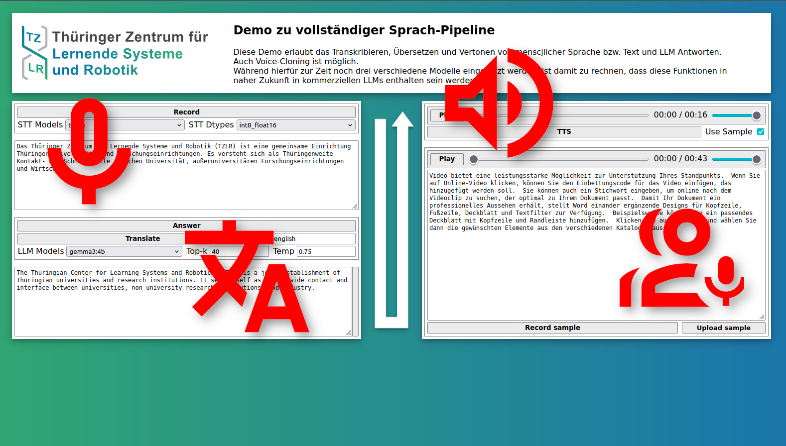 Der Demonstrator zeigt eine vollständige KI-basierte Sprach-Pipeline: Transkription, Übersetzung und Text-to-Speech mit optionalem Voice-Cloning in einer Vielzahl von Sprachen, u.a. Deutsch, Englisch oder Chinesisch.
