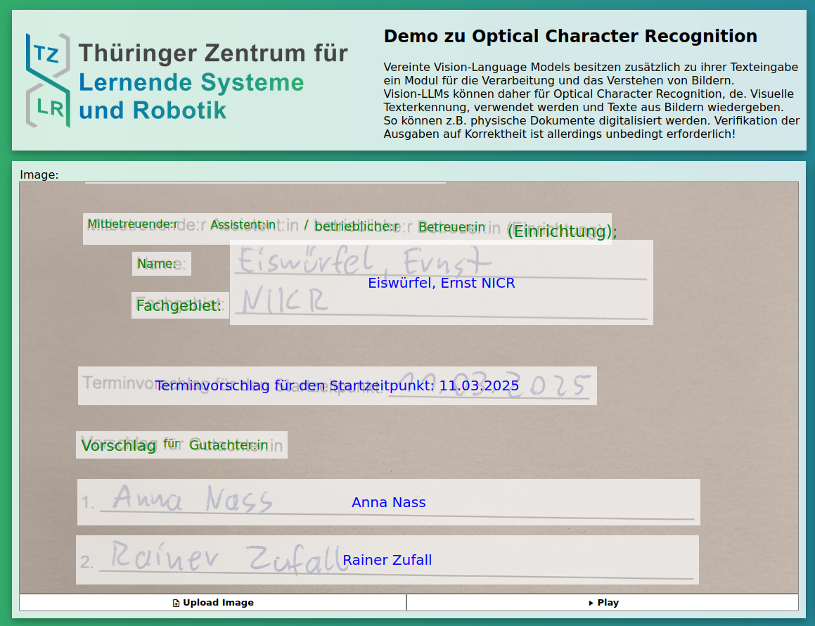 Multimodale LLMs können alleinstehend eingesetzt oder mit traditionellen Bildverarbeitungsmethoden und herkömmlicher OCR-Software kombiniert werden, um Formularen und Dokumente mit handschriftliche Einträgen zu digitalisieren. Dabei ist die Verwendung von lokal gehosteten LLMs möglich, wenn private oder sensitive Dokumente verarbeitet werden.